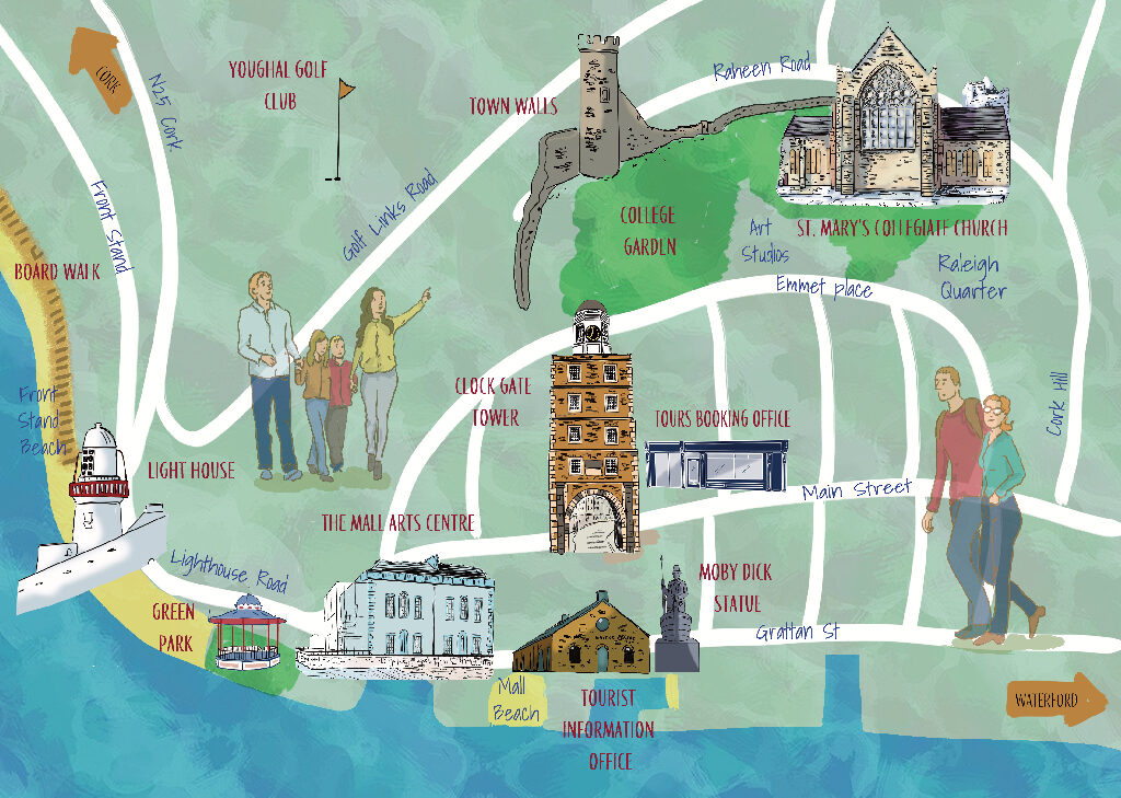 Discover the historic Irish coastal town of Youghal through detailed illustrations, capturing its medieval charm, stunning coastline, and timeless beauty.